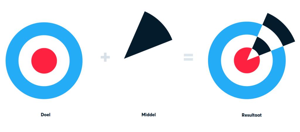 Ons beeldmerk bestaat uit twee onderdelen: de cirkels en de kegel. Deze staan voor het doel (de roos, het mikpunt) en de middelen (de ‘pijl’, onze wapenfeiten). Wij brengen die bij elkaar en zo ontstaat ons beeldmerk. De overlappende kleuren worden transparant.